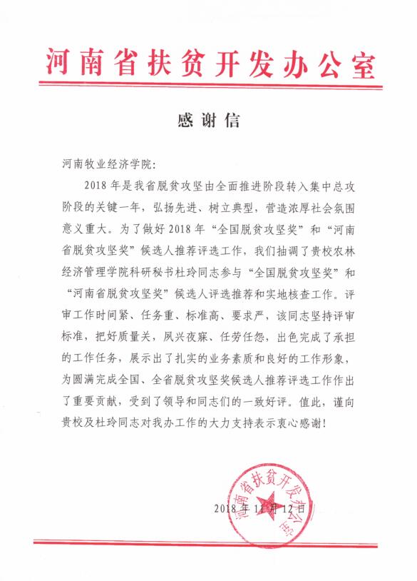 近日,河南省扶贫开发办公室给新葡萄官网发来感谢信,感谢新葡萄官网及农林经济管理学院杜玲老师对我省扶贫工作的大力支持。