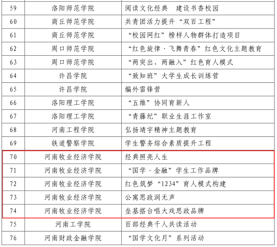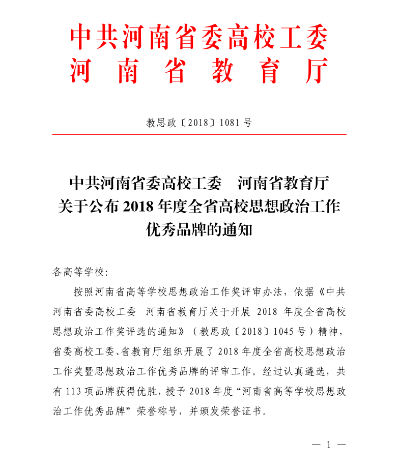 近日,中共河南省委高校工委、河南省教育厅下发文件(教思政〔2018〕1081号),公布了2018年度全省高校思想政治工作奖暨思想政治工作优秀品牌评审结果,全省共有113项品牌获得优胜,新葡萄官网获奖5项,创历史之最。
