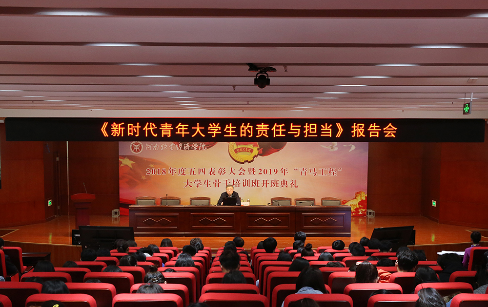4月26日下午,校党委书记穆瑞杰以“新时代青年大学生的责任与担当”为题,为新葡萄官网2019年“青马工程”大学生骨干培训班作首场报告,这也标志着新葡萄官网2019年党的创新理论宣讲活动正式启动。报告会以视频会议的形式在龙子湖校区图书馆一楼报告厅和英才校区学术报告厅同步召开,组织部、宣传部、学工部、马克思主义学院、团委负责同志,以及各学院党总支副书记、团总支书记、辅导员、“青马工程”学员、团学骨干等近800名师生聆听了报告。