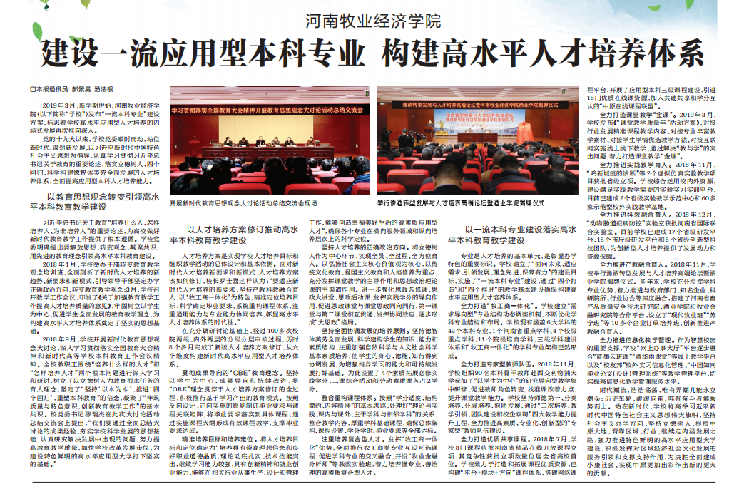4月29日,《河南日报》以《建设一流应用型本科专业构建高水平人才培养体系》为题报道了新葡萄官网认真学习贯彻习近平总书记关于教育的重要论述,落实立德树人、四个回归,科学构建德智体美劳全面发展的人才培养体系,全面提高应用型本科人才培养能力的相关情况(相关链接http://newpaper.dahe.cn/hnrb/html/2019-04/29/content_335891.htm)。