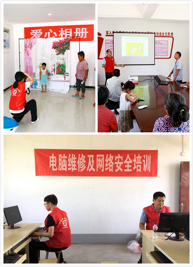 与此同时,学校志愿服务队在新蔡县大马庄村党群活动中心安营扎寨,开展了紧张有序的志愿服务活动。冒着炎炎烈日,信息工程学院党总支副书记蔡中民带领该院志愿者在不太大的帐篷下,精心为村民修理电磁炉、电饭煲、电风扇、洗衣机、电冰箱等家用电器,大家的衣服都湿透了,水都顾不上喝一口,一直忙到中午,直到最后一件电器修理完毕才收工。医疗卫生志愿服务分队在校医院院长梁天玉的带领下,自带药品和医疗器材设备,在大马庄村村党群活动中心设置了临时就诊点,热情为前来就诊的当地村民进行健康教育和血压血糖、心电图测量、针灸治疗等医疗卫生志愿服务,免费发放解暑降温药品。网络管理中心主任刘建朋等为多媒体教室检修,向当地村民开展网络安全教育,并赠送鼠标和网线等电脑器材。宣传部爱心相册志愿服务分队带着照相器材和设备,热心为村民开展现场照相活动,为村民们留下了一张张幸福的倩影。