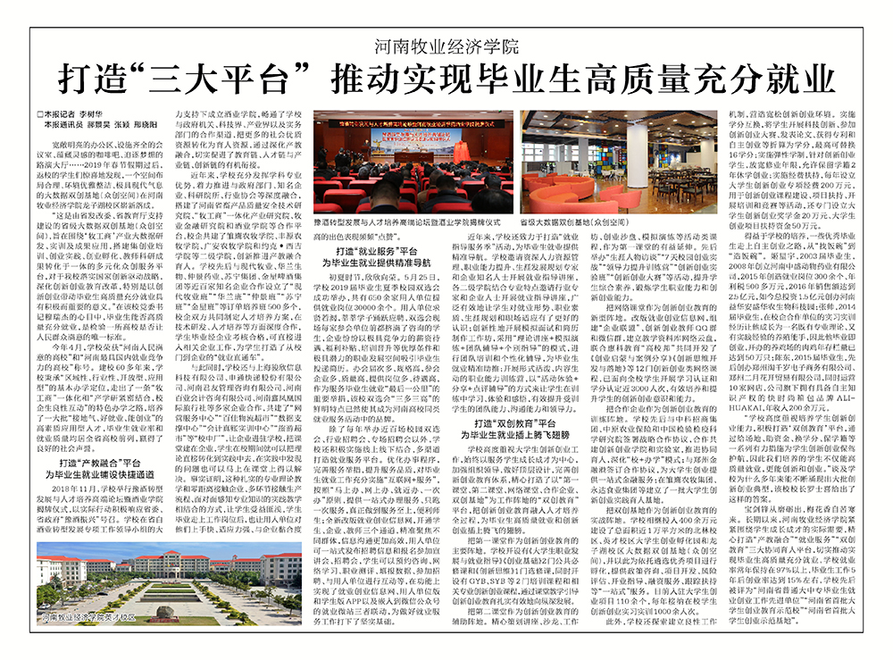 7月2日,《河南日报》以《打造“三大平台” 推动实现毕业生高质量充分就业》为题报道新葡萄官网紧紧围绕学生成长成才的实际需要,精心打造“产教融合”“就业服务”“双创教育”三大协同育人平台,切实推动实现毕业生高质量充分就业相关情况。(相关链接:http://newpaper.dahe.cn/hnrb/html/2019-07/02/content_350462.htm?from=timeline)全文转载如下: