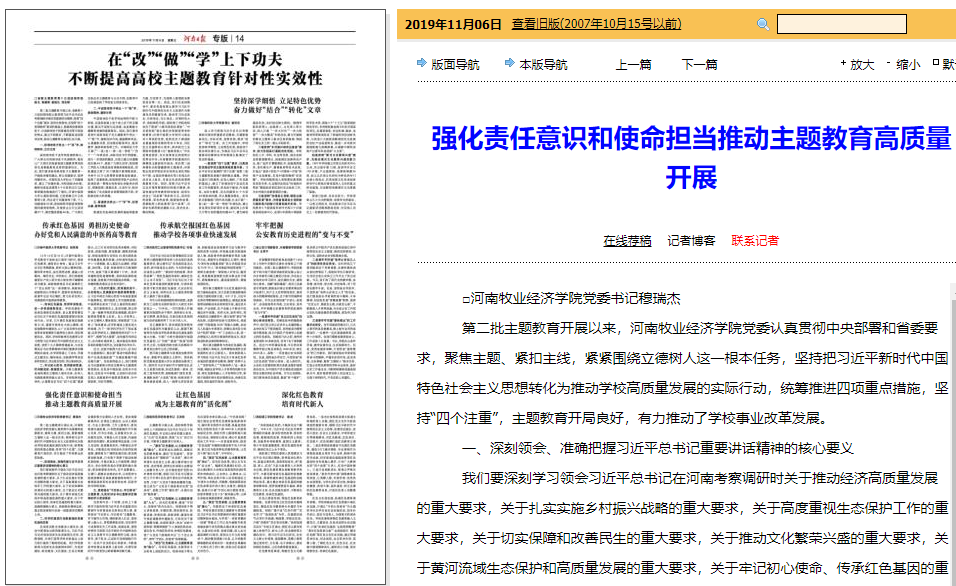 11月5日,《河南日报》刊发校党委书记穆瑞杰署名文章《强化责任意识和使命担当 推动主题教育高质量开展》,文章全面介绍了第二批主题教育开展以来,新葡萄官网党委认真贯彻落实中央部署和省委要求,聚焦主题、紧扣主线,紧紧围绕“立德树人”这一根本任务,坚持把学习贯彻习近平新时代中国特色社会主义思想转化为推动学校高质量发展的实际行动,有力推动了学校事业改革发展情况(相关链接:http://newpaper.dahe.cn/hnrb/html/2019-11/06/content_380621.htm)。全文转载如下: