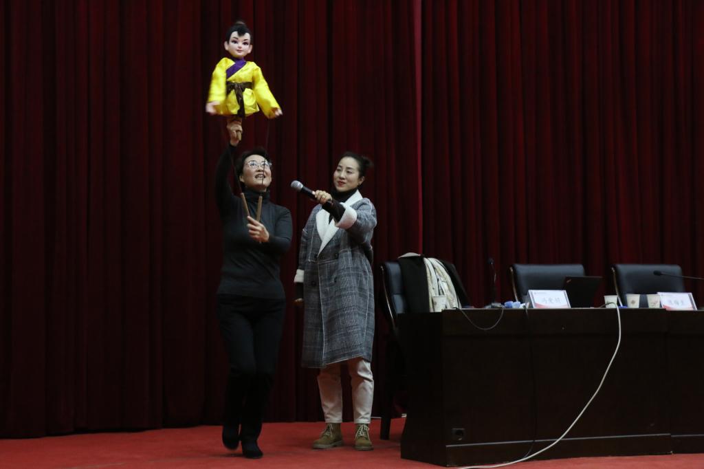 冯爱娟从中国传统木偶戏的概念、历史演变及木偶戏的种类、创新传承等方面为在座师生带来了精彩的《百戏之祖的木偶戏》报告,冯爱娟结合皮影及黑影戏视频赏析,亲身示范木偶操作艺术,使广大师生深入了解了传统木偶戏艺术“以木偶为媒介,以歌舞演故事”的生动特点。
