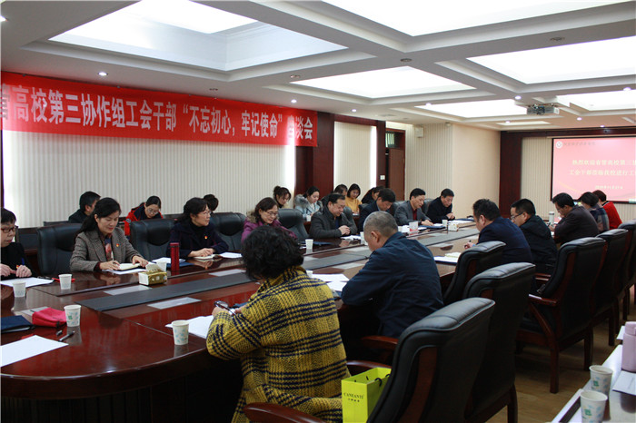 11月27日上午,新葡萄官网英才校区行政楼五楼会议室暖意融融,由河南省教科文卫体工会主办、新葡萄8883官网AMG工会承办的2019年度省管高校第三协作组工会干部“不忘初心、牢记使命”专题座谈会暨联谊活动在新葡萄官网如期举办。中原工学院党委副书记、工会主席黄乾,新葡萄官网副校长程慎出席座谈会。来自中原工学院、新葡萄8883官网AMG、河南工程学院、河南财政金融学院、河南医学高等专科学校、郑州城市职业学院、河南师范大学新联学院、升达经贸管理学院等八所高校的50多名专职工会干部参加了座谈会。会议由校工会副主席刘官生主持。