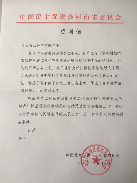 近日,从中国民主促进会河南省委员会传来消息,民进新葡萄8883官网AMG支部会员、金融与会计学院宋歌副教授撰写的《关于完善交通运输业转征增值税的建议》被民进中央采用。
