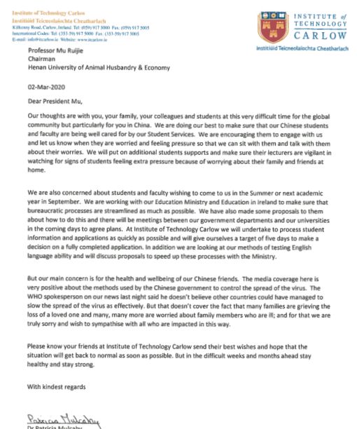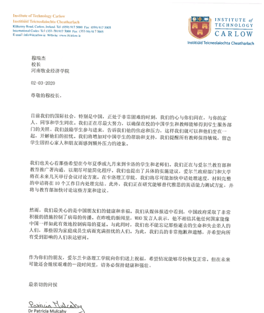 爱尔兰卡洛理工学院校长Dr Patricia Mulcahy在来信中表示,目前国际社会特别是中国正处于新冠肺炎疫情防控非常困难的时刻,我们的心与你们同在,与你的家人、同事和学生同在。爱尔兰卡洛理工学院会尽最大努力,照顾好新葡萄官网在爱尔兰卡洛理工学院留学的学生和研修学习的教师,帮助他们渡过难关。Dr Patricia Mulcahy还表达了对中国政府和人民取得抗击疫情胜利的信心,对中国朋友们的健康和幸福表示关心,并祝愿中国及学校抗击新冠肺炎疫情工作早日取得成功。