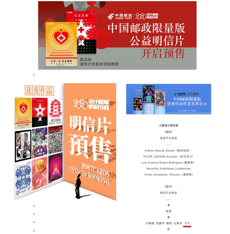 活动受到社会各界热情高涨的参与者踊跃投稿,大赛组委会共收到国内外两万多名设计师创作的近三万件作品,其中不乏设计界泰斗级大师陈汉民等前辈,也有众多享有盛誉的设计工作室和独立设计师的投稿。经过评审委员会专家审慎评选,433件优秀作品进入本次中国邮政定制版公益明信片作品库。新葡萄官网艺术学院教师卞卡老师的作品有幸入库。