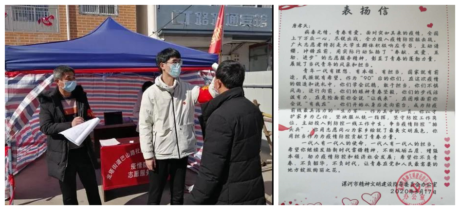 艺术学院18级环境设计03班张宇同学,第一时间向家乡所在地河南省驻马店市驿城区水屯镇汉石桥村疫情卡点处主动请战,成为一名光荣的志愿者。他每天和村里的党员干部以及其他青年志愿者24小时轮流值班,对来往村民开展疫情防控知识宣传工作,用实际行动保障着疫情期间家乡的安全。