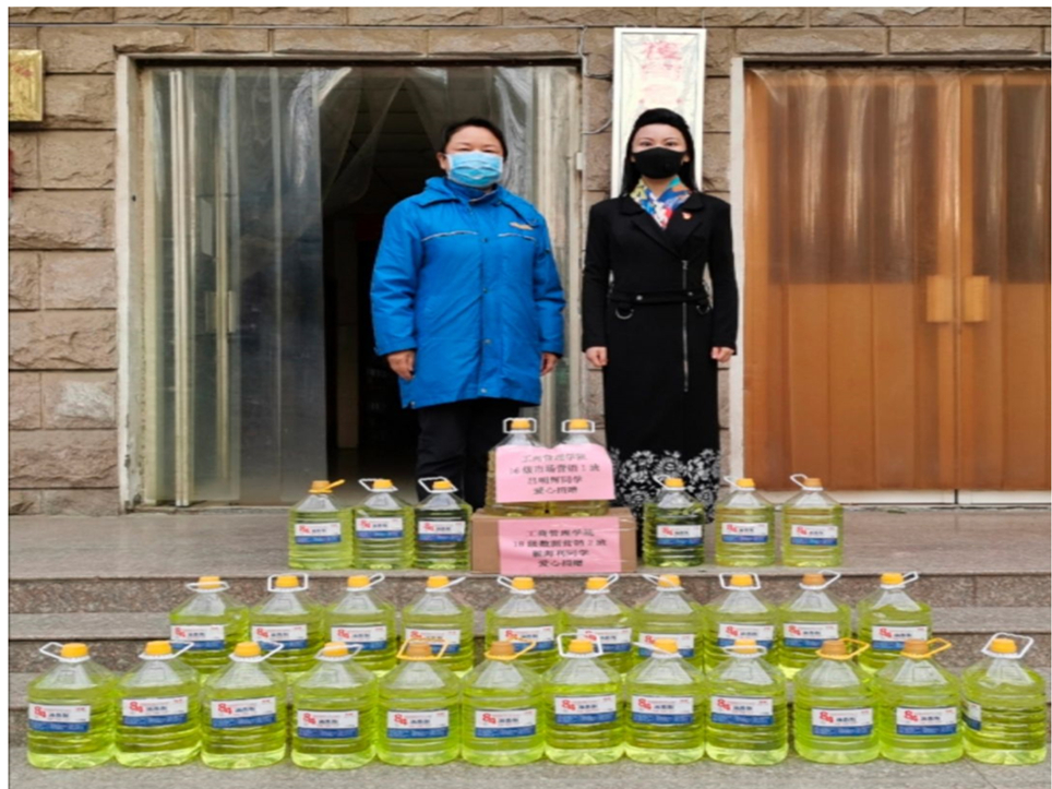 国际教育学院19级会计01班陈怡含同学向学校捐赠消毒液100斤,19级会计(专)02班学生刘畅向学校捐赠1200个一次性医用外科口罩,他们用实际行动为学校防疫工作贡献了力量,充分展现了新时代大学生高度的社会责任感和爱国爱校之心,体现了学校落实立德树人根本任务的实际成效。