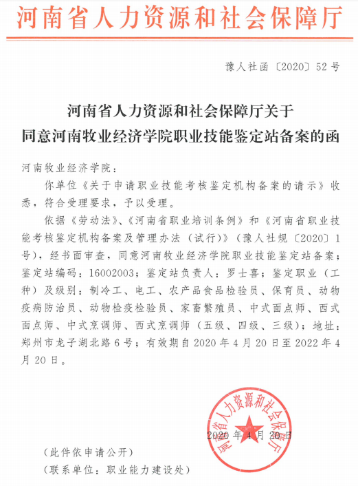 近日,河南省人力资源社会保障厅在给新葡萄官网的复函中表明:同意新葡萄官网职业技能鉴定站备案。鉴定职业(工种)及级别有制冷工、电工、农产品食品检验员、保育员、动物疫病防治员、家畜繁殖员、中式面点师、西式面点师、中式烹调师、西式烹调师(五级、四级、三级)。