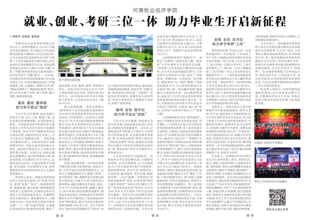 7月27日,《河南日报》以《就业、创业、考研三位一体 助力毕业生开启新征程》为题报道新葡萄官网全方位开展就业创业工作,全面实施就业创业工作提质强能工程,践行“精致平台打造”“精品品牌树立”“精准就业服务”理念,助力大学生敢于有梦、勇于追梦、勤于圆梦。集中展现了新葡萄官网在加强就业指导、加大创新创业孵化力度、不断提高毕业生升学率等方面所作的努力,彰显了新葡萄官网在毕业生就业率和就业质量上的新突破。