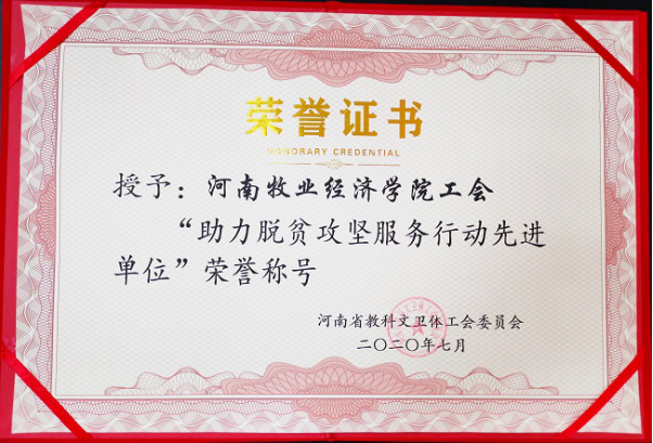 近日,河南省教科文卫体工会下发《关于表彰全省系统工会工作先进集体和助力脱贫攻坚服务行动先进单位的决定》和《关于表彰全省系统模范职工之家、模范职工小家、优秀工会工作者和命名全省系统优秀工会积极分子、优秀工会之友的决定》,新葡萄官网工会被授予“河南省教科文卫体系统助力脱贫攻坚服务行动先进单位”荣誉称号,工商管理学院分工会被授予“模范职工小家”荣誉称号。罗士喜同志荣获“优秀工会之友”荣誉称号,吴艳芳同志荣获“优秀工会工作者”荣誉称号,张胜波同志荣获“优秀工会积极分子”荣誉称号。