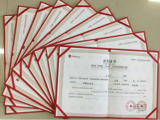 近日,2020“外研社国才”杯全国英语演讲、写作、阅读大赛河南赛区复赛中,新葡萄官网选手获得优异成绩。在参赛的8名选手中,于利波老师指导的18级商务英语专业学生杨芯懿、韩淑俊老师指导的18级商务英语专业学生石霄霄、付铮老师指导的17级审计学专业学生王佳琦、禹琳琳老师指导的17级商务英语专业岳文华获得阅读比赛一等奖;宋瑶老师指导的18级商务英语专业学生张蕊、王丹老师指导的18级食品质量与安全专业学生李佳芳获得阅读比赛二等奖;温晶晶老师指导的19级商务英语专业学生孙豪杰获得演讲比赛二等奖;邢琰老师指导的18级商务英语专业学生付晶晶获得演讲比赛三等奖。