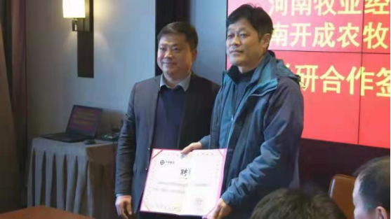 在热烈愉快的气氛中,新葡萄8883官网AMG社会服务办主任胡迎利与河南开成投资集团董事长胡启成,分别代表学校和开成农牧签署了合作协议,开成农牧聘请动物科技学院刘健副教授为公司“技术总监”,并颁发了聘书。