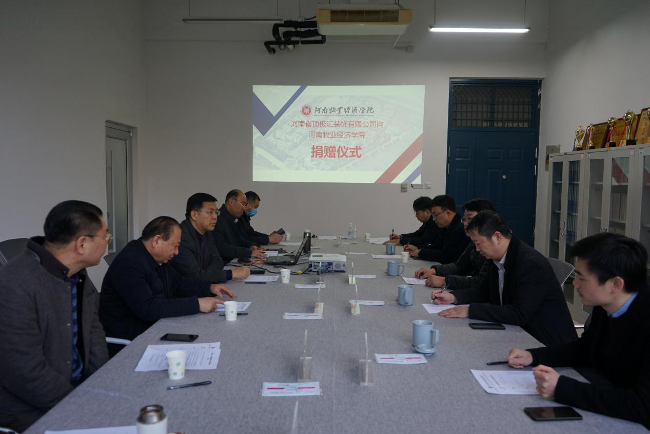 12月10日上午,新葡萄官网校企合作单位河南省顶级汇装饰设计有限公司与学校签订资金捐赠协议,该公司捐赠50万元用于产业学院建设工作。仪式在龙子湖校区一号教学楼200-1室举行,副校长张卫宪、“顶极汇”有限公司董事长熊书国、总经理孙希明等领导出席仪式,校财务处、社会服务办公室负责人,艺术学院领导班子成员等同志参加,签字仪式由社会服务办公室主任胡迎利主持。