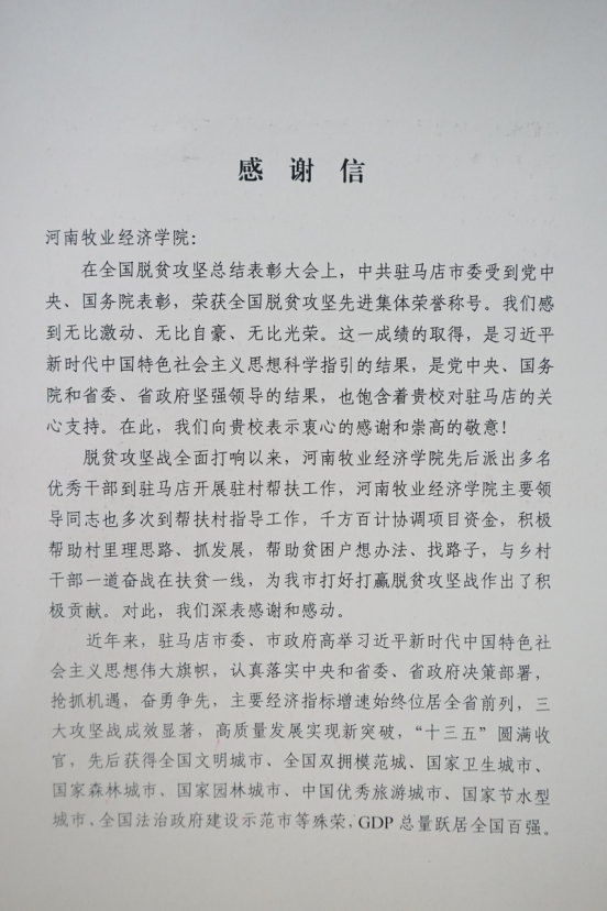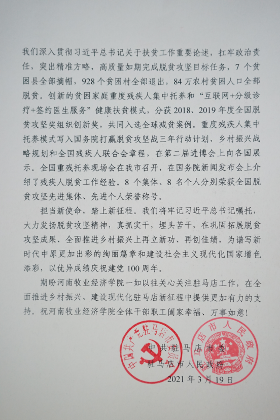 近日,中共驻马店市委、驻马店市人民政府向新葡萄官网发来感谢信,感谢新葡萄官网对驻马店市脱贫工作作出的积极贡献。