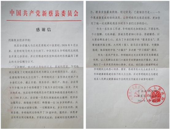 近日,中共新蔡县委、新蔡县人民政府向新葡萄官网发来感谢信,感谢新葡萄官网对新蔡县健康扶贫工作和健康新蔡建设给予的大力支持,感谢新葡萄官网中医科医生李明晓同志为增进新蔡县人民群众健康福祉作出的积极贡献。