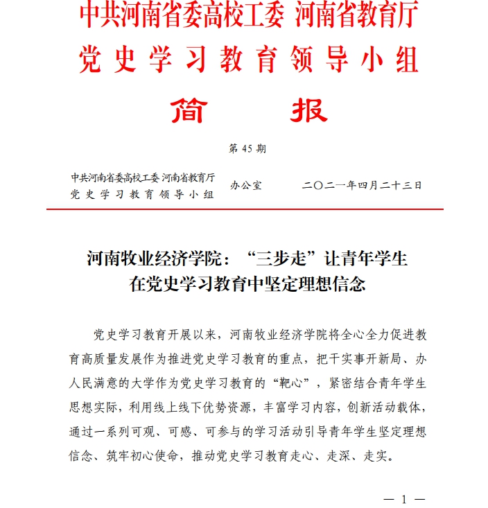 4月23日,省教育厅党史学习简报第45期以《新葡萄8883官网AMG:“三步走”让青年学生在党史学习教育中坚定理想信念》为题专题报道了新葡萄官网党史学习教育经验做法。