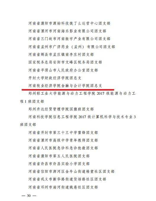 全校各级共青团组织凝心聚力、砥砺奋进、勇开新局,金融与会计学院坚持“以生为本”教育理念,以理想信念教育为核心,以服务青年成长成才为己任,全力提升共青团组织“三力一度”,围绕提升大学生“四项素质”,着力营造“国学·金会”校园文化氛围,在思想政治、创新创业、体育美育、成长成才等方面取得了显著成绩。所属团支部曾获全国高校“活力团支部”,“道德大讲堂”育人项目获河南省高校精神文明建设优秀工作案例二等奖,“创新创业训练计划”获省级立项;团员青年先后获“挑战杯”大学生课外科技竞赛省级银奖、志愿服务贫困县“优秀志愿者”“河南省最美大学生”、河南省“社会实践先进个人”等成绩和荣誉称号。