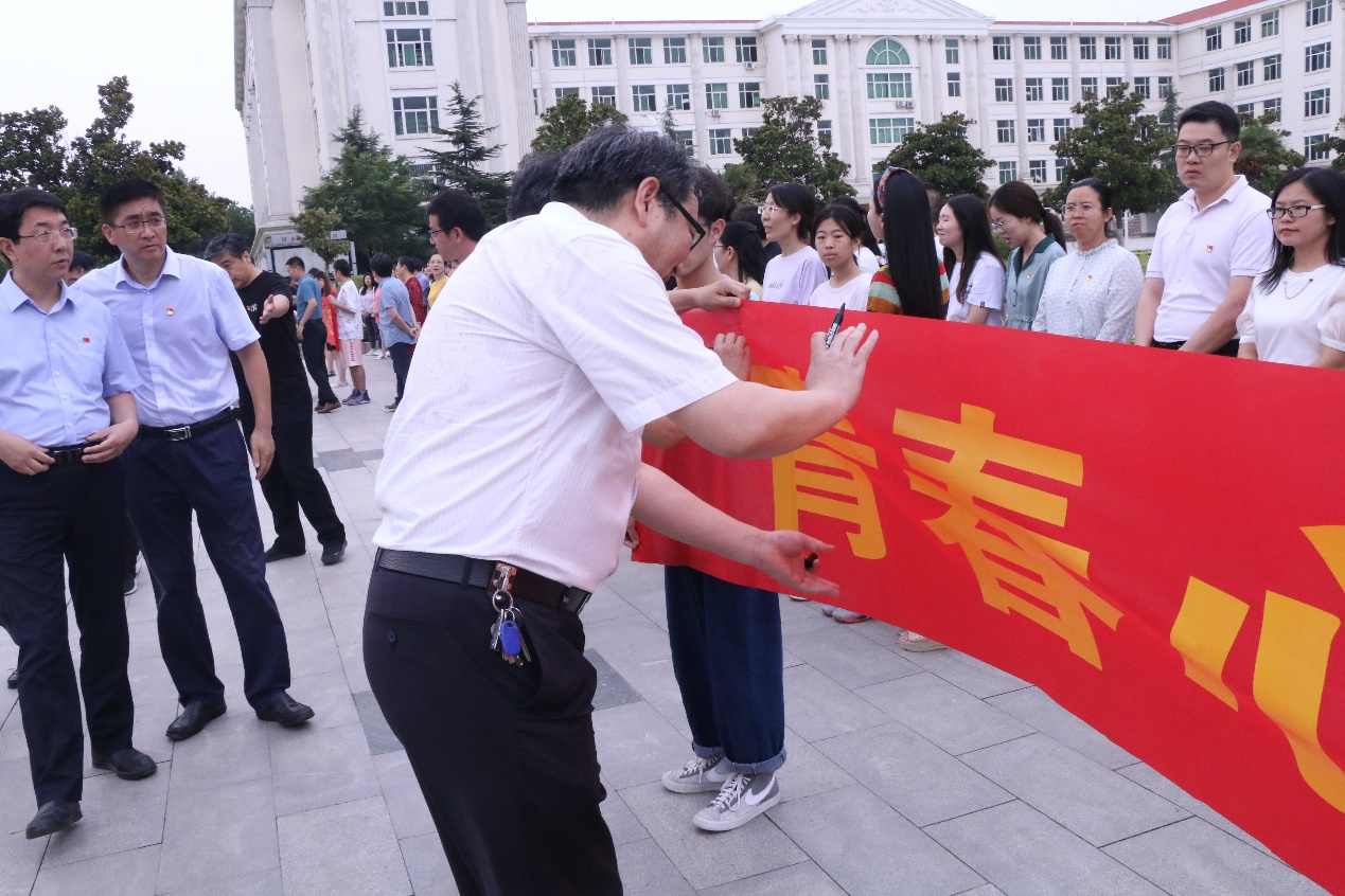 仪式后,穆瑞杰带领师生在“青春心向党 百年共荣光”条幅上签名。