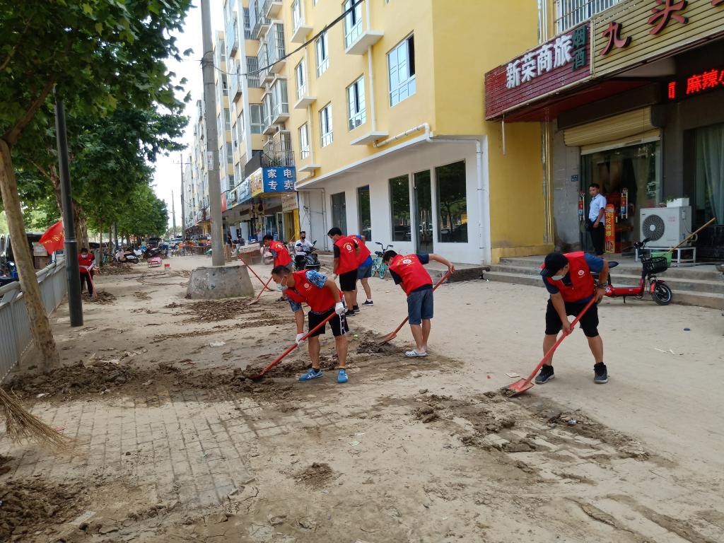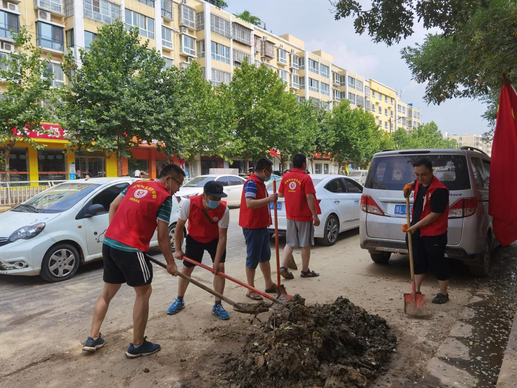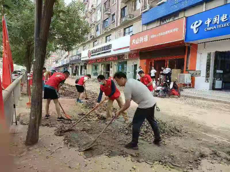 龙子湖街道位于贾鲁河南岸,地势低洼,洪水过境期间,周边道路、临街商铺、所属社区全部被淹,受灾严重。积水退去后,路面留下大量淤泥和垃圾,清理难度大。志愿者们顾不上雨后的闷热,顶着烈日,和现场的社区干部职工一起在你一锹、我一铲地忙碌着,他们用铁锹将大量淤泥铲到指定地点,用双手把浸没在淤泥里的杂物、垃圾和树叶枯枝统一捡出堆放。汗水浸透了他们的衣服,泥浆沾满了他们的鞋子,面对高温和如此巨大的工作量,没有一个人嫌苦、没有一个人喊累、更没有一个人怕脏,大家积极投入工作,丝毫没有放慢速度,持续奋战在清淤一线。经过大家一天的努力,清淤工作取得阶段性成效,姚夏路(育翔路至薛夏南街段)人行步道淤泥基本清理完毕,街道两旁恢复了往日的整洁。