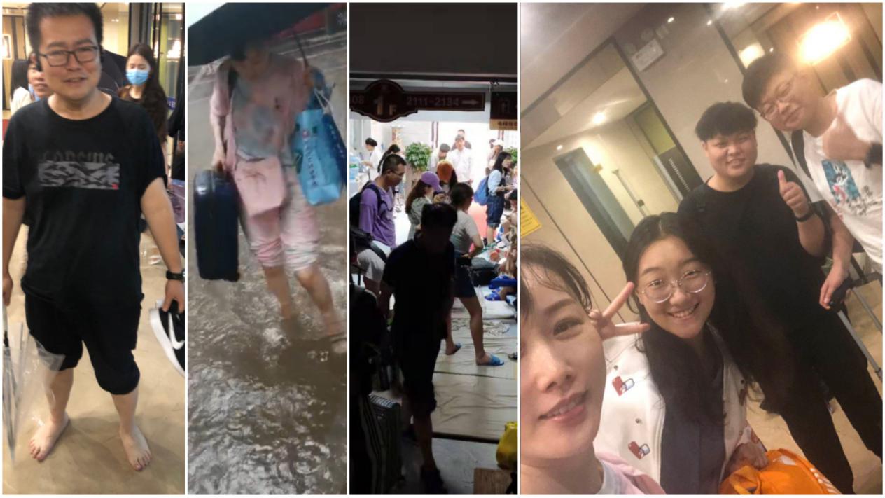 7月21日中午,从大赛组委会得到确切消息,比赛推迟于下午三点开始,为了给参赛队员补充体力,陈莉和范巍决定涉水外出为大家购买午饭,平时看似毫不起眼的一件小事,在灾难面前也变得艰难起来。参赛的两位男学生赵立博和李欢海自告奋勇,他们一行四人互相搀扶,淌着已经齐腰的积水为大家购买午饭。