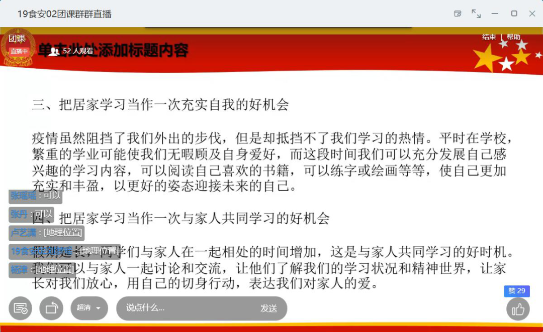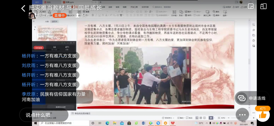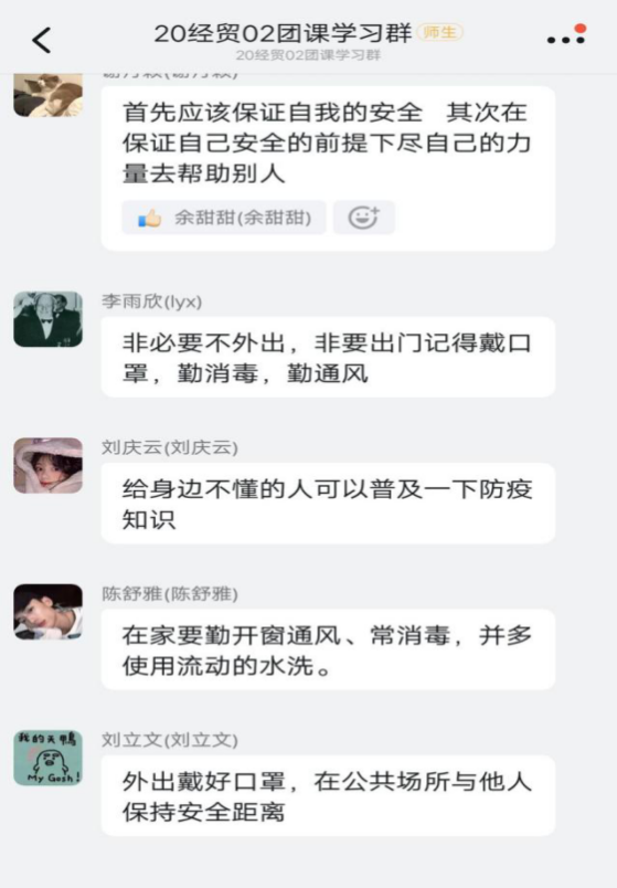 文法学院各班级团支部结合各种新闻资源,为学生分析了在家中为灾后整治以及疫情防控贡献自己的一份力量的重要性。让学生感受到中华民族的伟大精神力量是战胜灾情、疫情的有力武器。