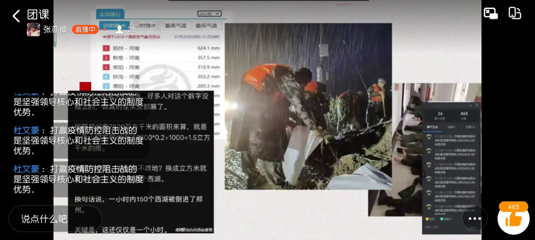 通过团课,青年学生认识到了生活哪有那么多岁月静好,只不过是有人替我们负重前行。致敬在防汛救灾一线努力拼搏的“无名英雄”,致敬在灾情面前的“逆行者”,致敬每一个为战胜汛情而默默付出的“平凡人”。(各二级学院团委供稿)