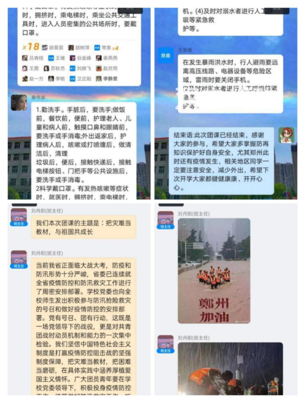食品与生物工程学院(酒业学院)各班分别讲述了不同的防汛救灾故事。面对日益严峻的疫情形势,各班级团支部呼吁大家一定要关注国内外疫情动态,不信谣不传谣,不前往中高风险地区。