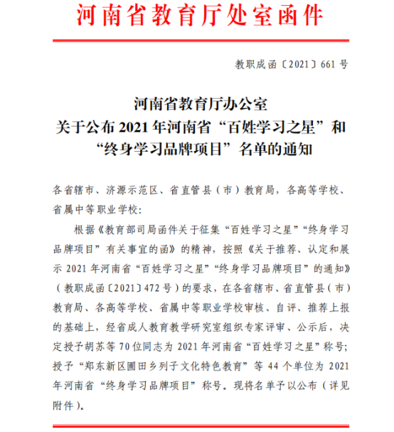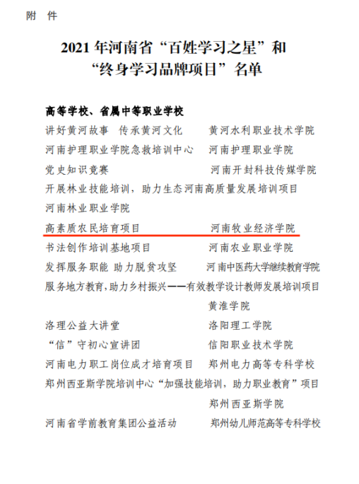 近日,河南省教育厅发布《河南省教育厅办公室 关于公布2021年河南省“百姓学习之星”和“终身学习品牌项目”名单的通知》(教职成函〔2021〕661号),由新葡萄官网继续教育学院牵头申报的高素质农民培训项目被授予2021年河南省“终身学习品牌项目”,这是新葡萄官网高质量推进高素质农民培育,助力乡村振兴战略实施的又一重大成果。