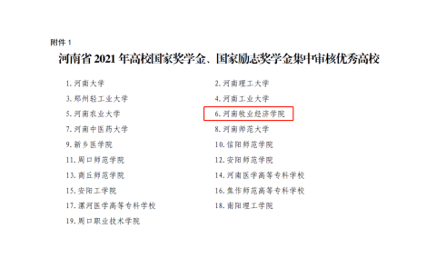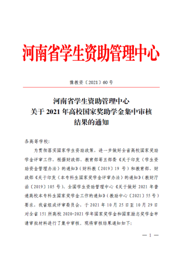 近日,河南省学生资助管理中心下发《关于2021年高校国家奖助学金集中审核结果的通知》(豫教资〔2021〕60 号),公布了对全省151所高校2020-2021学年国家奖学金和国家励志奖学金申请审批材料集中审核的结果,新葡萄官网以申报信息填报准确、申报内容填写规范、申报标准执行到位、整体质量较好等突出业绩,荣获集中审核优秀高校。