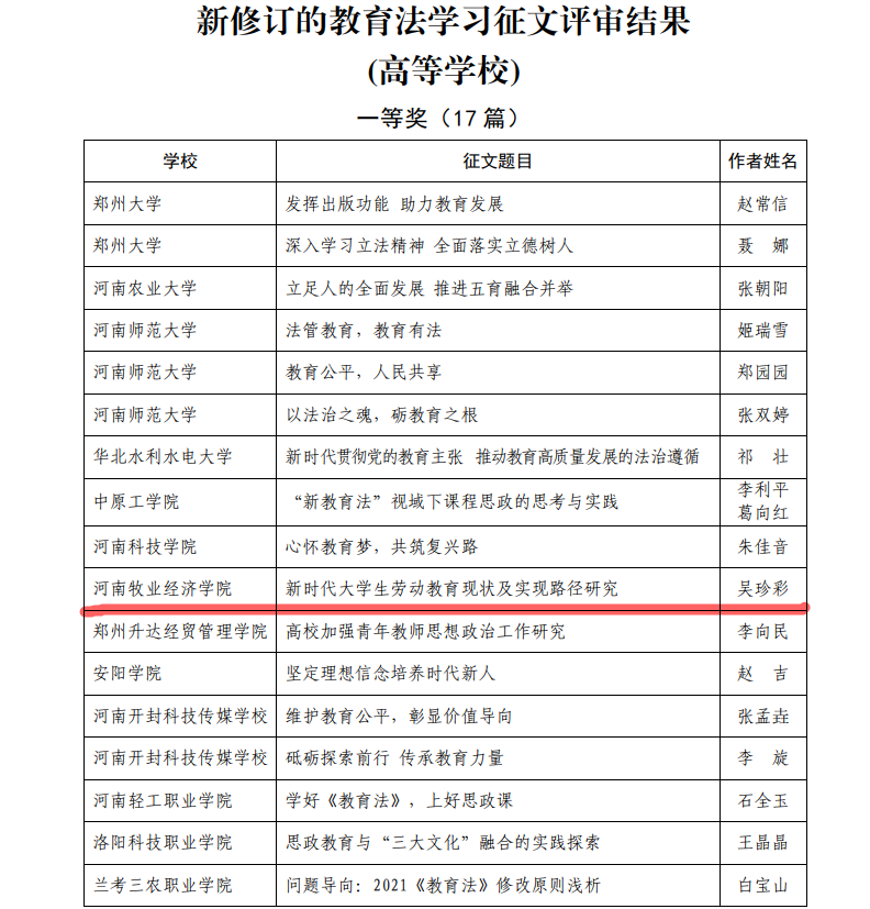 近日,河南省教育厅办公室发布《关于公布新修订的教育法学习征文评审结果的通知》(教办政法〔2021〕347号),新葡萄官网经济与贸易学院教师吴珍彩博士提交的论文《新时代大学生劳动教育现状及实现路径研究》荣获征文一等奖。
