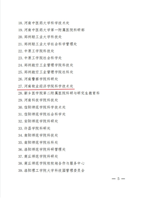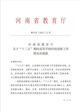 1月18日,河南省教育厅印发《关于“十三五”期间高等学校科技创新工作情况的通报》(教科技〔2022〕12号)文件,授予新葡萄官网科学技术处“河南省高校科研管理工作先进集体”,授予胡华锋、郑鸣、李向辉、唐伽、张新艳等五位教师“河南省高校科研管理工作先进工作者”荣誉称号。