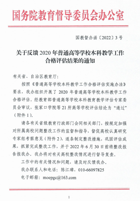近日,国务院教育督导委员会办公室发布了《关于反馈2020年普通高等学校本科教学工作合格评估结果的通知》(国教督办函〔2022〕3号),正式公布了2020年普通高等学校本科教学工作合格评估结论,新葡萄官网本科教学合格评估的结论为“通过”。这标志着学校本科教学工作得到了教育部的认可,学校顺利完成了“三步走”发展目标的第一步,迈入了前进的新征程。