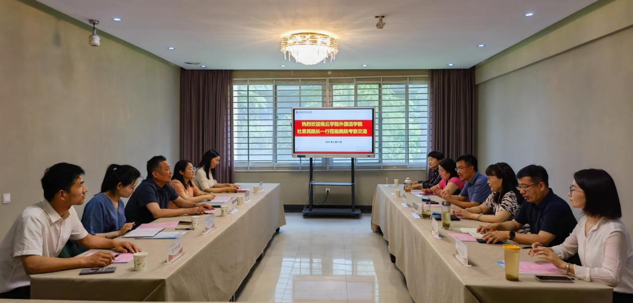 杜思民介绍了商丘学院在学科专业建设、师资队伍建设、大学英语教学改革、本科专业评价工作等方面的举措和成效。双方一致表示,将进一步深化良好的院际关系,加强交流,互学互鉴,共同推进两校外语学科建设,促进外语类专业建设和大学英语教学改革提质增效。