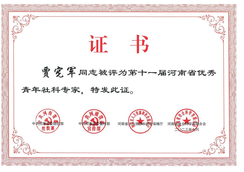 近日,经河南省优秀青年社科专家评委会评选,省优秀青年社科专家评选工作领导小组研究,第十一届“河南省优秀青年社科专家”评选结果揭晓,新葡萄官网工商管理学院院长贾宪军成功入选。