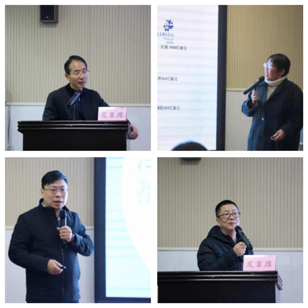 河南省物流学会会长、郑州大学管理学院副院长李玉民教授(左上)、新加坡驻华使馆商务处官员Lim Jit Mui进行主题演讲(右上)、河南省物流与采购联合会冷链行业分会秘书长郭鹏(左下)进行报告分享,郑州航空工业管理学院管理工程学院院长王永刚(右下)进行成果推介