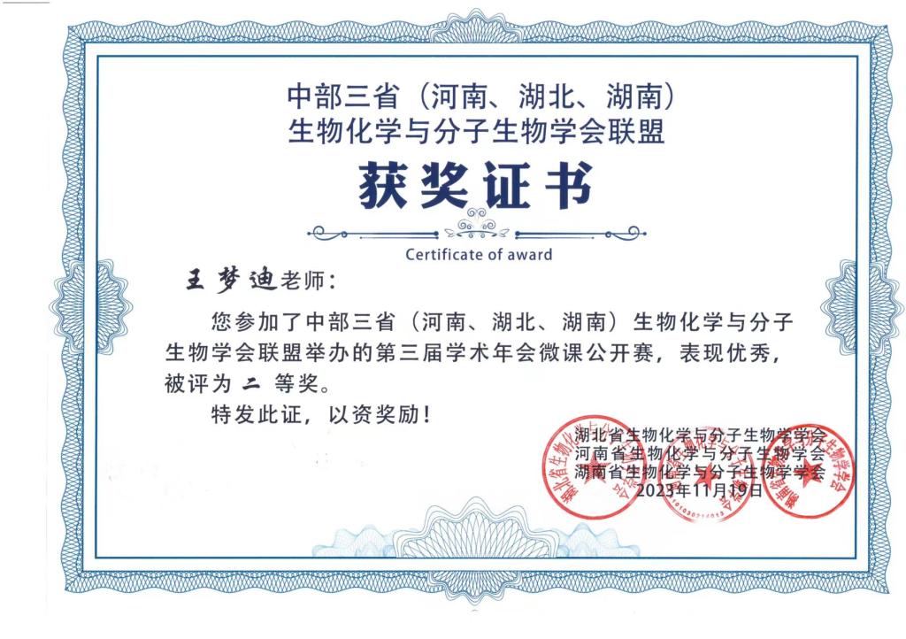 为促进中部三省(河南、湖北、湖南)生物化学与分子生物学领域的学术与教学交流,加强协作,提升科研、教学和人才培养水平,于2023年11月17-20日,在湖北省武汉市召开了“中部三省(河南、湖北、湖南)生物化学与分子生物学会联盟第三届学术年会”。新葡萄官网食品与生物工程学院生物化学课程组王梦迪博士参会,并喜获此次年会中微课公开赛二等奖。