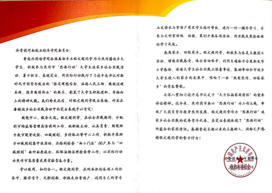 近日,共青团焦作市委员会发来表扬信,对外国语学院2019级旅游英语专业学生程文超在焦作市“思源行动”大学生返家乡社会实践活动中的突出表现予以表扬和感谢。