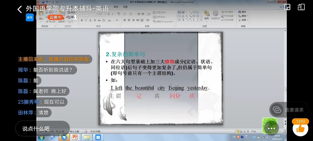 在《英语语法规约与语篇分析》讲座上,闻华老师对专升本英语学科试卷结构、分值以及试卷变化趋势进行分析,从单词、句子、语法、语篇等角度展开讲解。他指出,在英语学习中单词和语法是基础,必须扎实积累、灵活运用,通过大量做题熟悉各类用法,用心揣摩和分析,坚定信心,完全能够学好英语。
