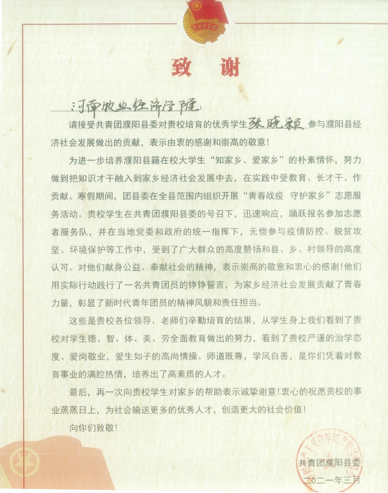 近日,动物医药学院收到共青团濮阳县委发来的感谢信,对新葡萄官网动物医药学院2020级学生张晓颖在春节期间积极投身家乡经济社会发展表示感谢。
