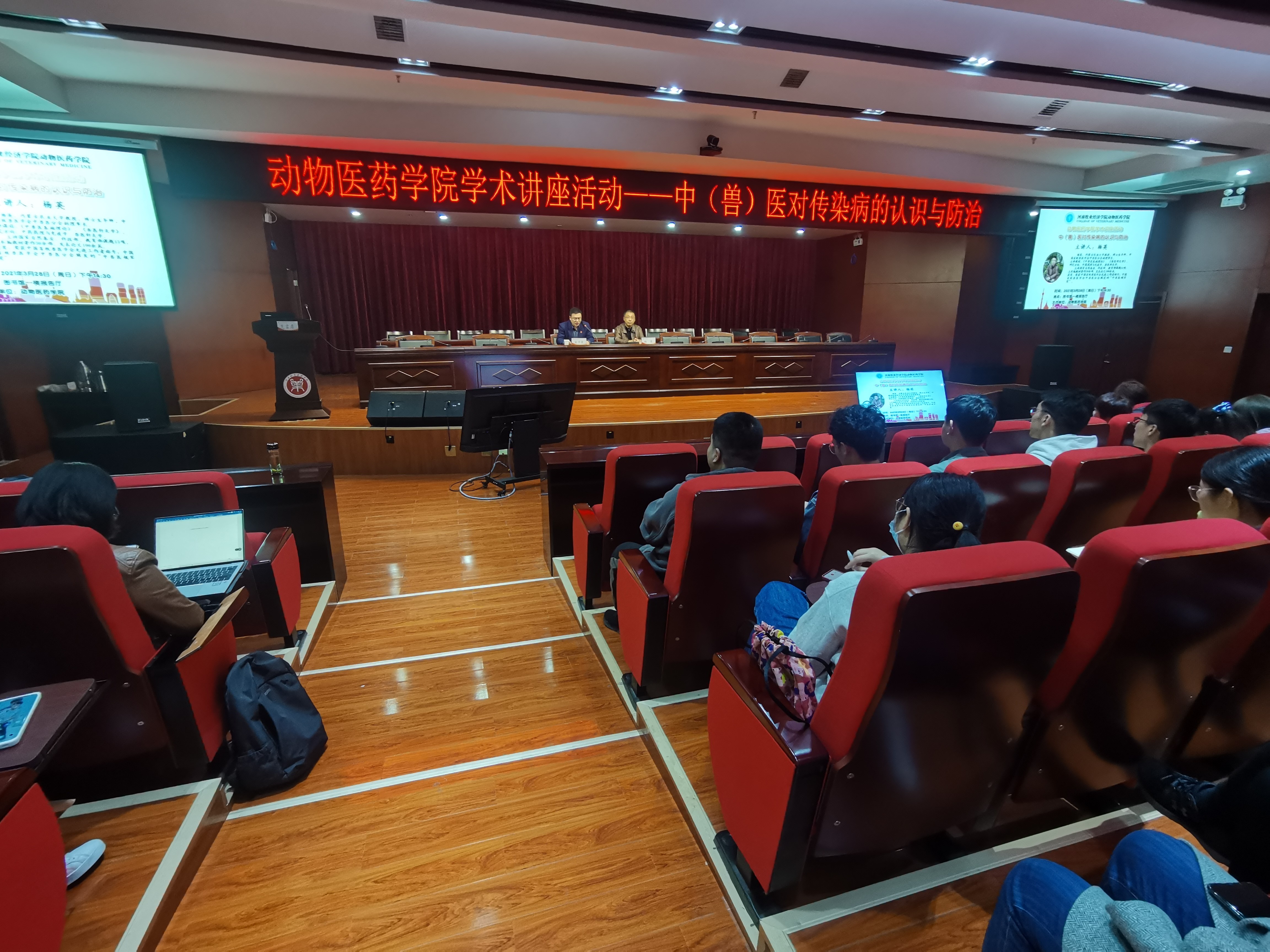 3月25日、28日,动物医药学院在龙子湖校区图书馆一楼报告厅分别开展“家禽疱疹病毒研究和国家基金项目的申报与设计思路”及“中(兽)医对传染病的认识与防治”名师讲坛活动。活动特邀河南省农科院免疫学重点实验室研究员罗俊、内蒙古农业大学教授、博士生导师杨英,动物医药学院全体教师和2019级本科学生代表参加活动。名师讲坛活动由动物医药学院院长宋予震主持。