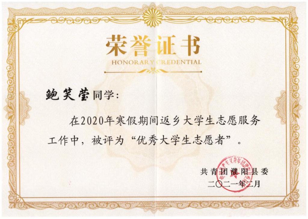 2021年的春节,在阻止疫情反弹的特殊时期,艺术学院2018级环设04班学生鲍笑莹,积极主动担当作为,加入共青团濮阳县委开展的“青春战疫、守护家乡”2020年寒假返乡大学生志愿服务活动中,表现优异,荣获“优秀大学生志愿者”称号,同时收到来自共青团濮阳县委的感谢信。