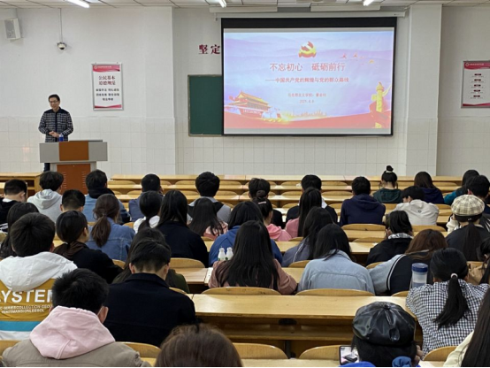 4月8日下午,马克思主义学院董金柱博士以《不忘初心,砥砺前行——中国共产党的辉煌与党的群众路线》为题,在英才校区W-109教室为文法学院2020级学生作专题讲座。