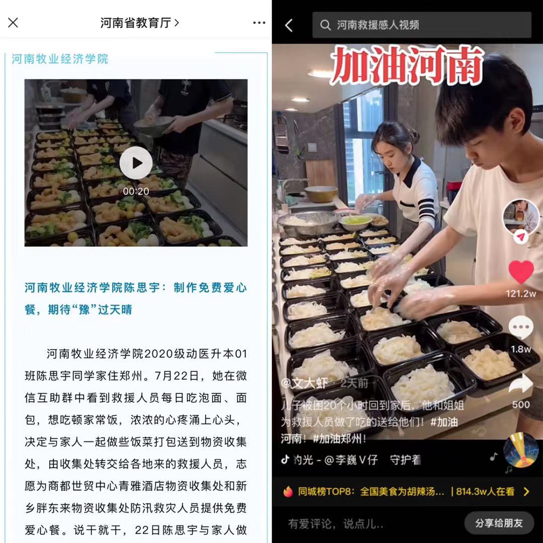 24日为志愿者做了炸油条和卤鸡蛋,煎饺子。当她听闻救援人员好几天没吃蔬菜了,便在饭菜中加入了青菜。24日晚陈思宇和家人开车到新乡物资收集处,向救援人员提供了近一百份晚餐的同时,还自发加入到物资收集处搬运传递物资的队伍中,帮助搬运物资。陈思宇和家人一起为救援人员准备爱心餐的视频,在抖音平台上一经发出,第一日点赞量高达120W,网友纷纷表示,这就是当代青年的模样,互爱互助,共渡难关。