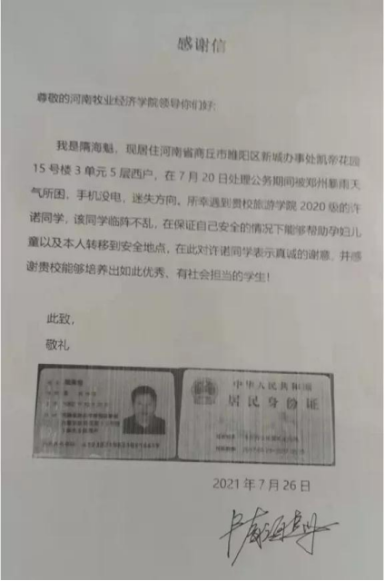 在这封感谢信中,隋海魁详细描述了事件经过:“7月20日处理公务期间被郑州暴雨天气所困,手机没电,迷失方向。所幸遇到贵校旅游学院2020级的许诺同学,该同学临阵不乱,在保证自己安全的情况下能够帮助孕妇儿童以及本人转移到安全地点……”。为表达对许诺同学的感谢,隋海魁邮寄来了一封感谢信,信中没有华丽的辞藻,但饱含深情地赞扬了许诺同学挺身而出、乐于奉献的高贵品质。这封感谢信承载着的不仅是对许诺同学助人为乐的感谢,更是对新时代大学生精神风貌的高度肯定。