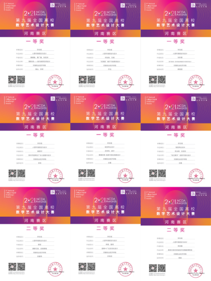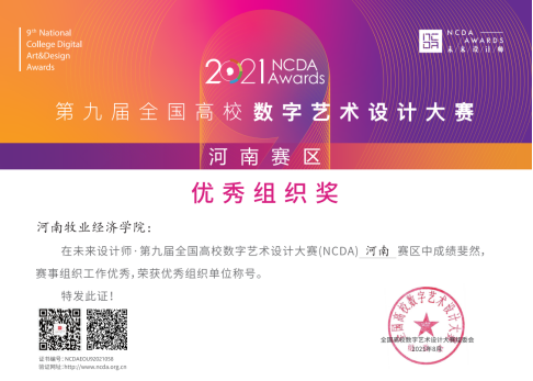 近日,2021年第九届全国高校数字艺术设计大赛(NCDA)省赛、国赛获奖名单相继揭晓,新葡萄官网艺术学院师生喜获全国二等奖1项,全国三等奖4项;另获河南赛区省赛一等奖6项、二等奖16项、三等奖14项,奖项总计41件次;艺术学院荣获大赛优秀组织单位。新葡萄官网在本次大赛获奖量位居全国同类高校前列。