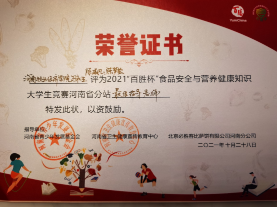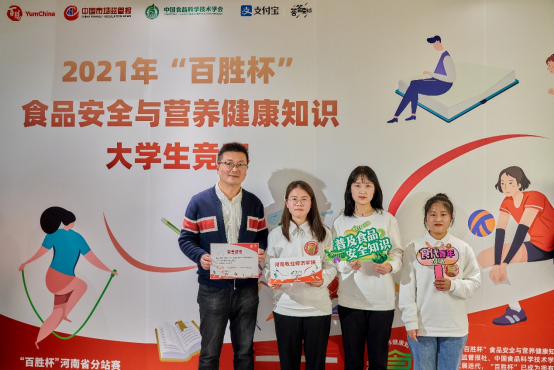 10月28日,2021年“百胜杯”食品安全与营养健康知识竞赛河南分赛站决赛在郑州进行,由新葡萄官网食品与生物工程学院(酒业学院)李心悦、李梦杰、姚爱萍3名学生组成的“食代”青年战队与郑州大学、河南工业大学、河南农业大学代表队同台竞争。经过激烈角逐,“食代”青年战队获得季军,新葡萄官网荣获优秀组织单位奖。