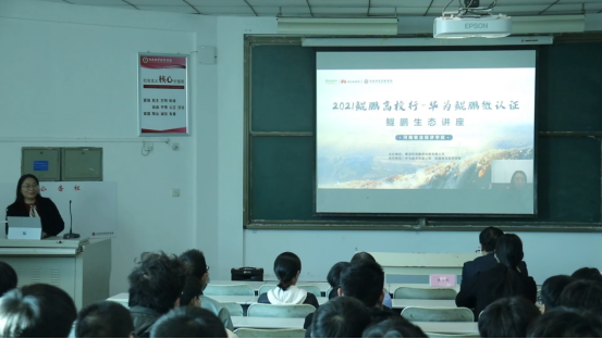 本次鲲鹏微认证活动分专题讲座、线上集中辅导、答疑与认证三个阶段。华为云培训高级讲师邹丹娜作了题为《鲲鹏生态体系》的专题讲座。讲座围绕鲲鹏计算产业,详细介绍了鲲鹏计算产业的组成、鲲鹏应用移植、鲲鹏认证、华为云鲲鹏云服务的技术创新与应用场景等,呈现了鲲鹏计算产业的开发者生态、技术生态、产业生态等生态全景,对相关技术实践和解决方案进行了分享,使同学们受益匪浅。